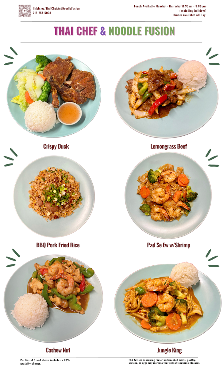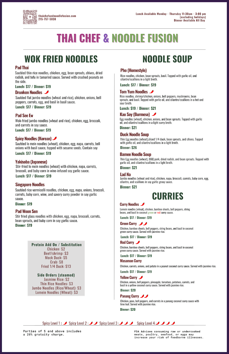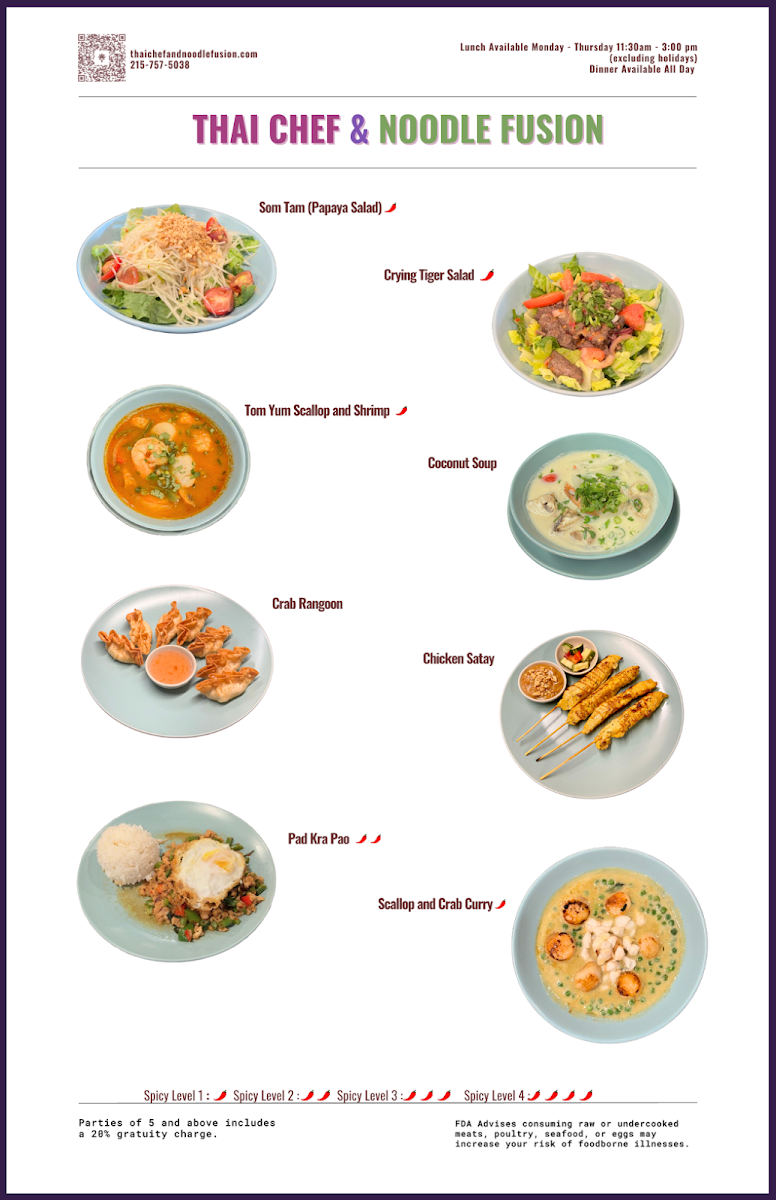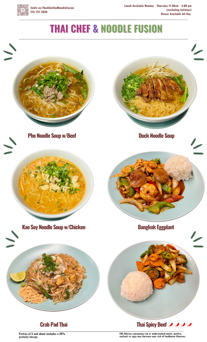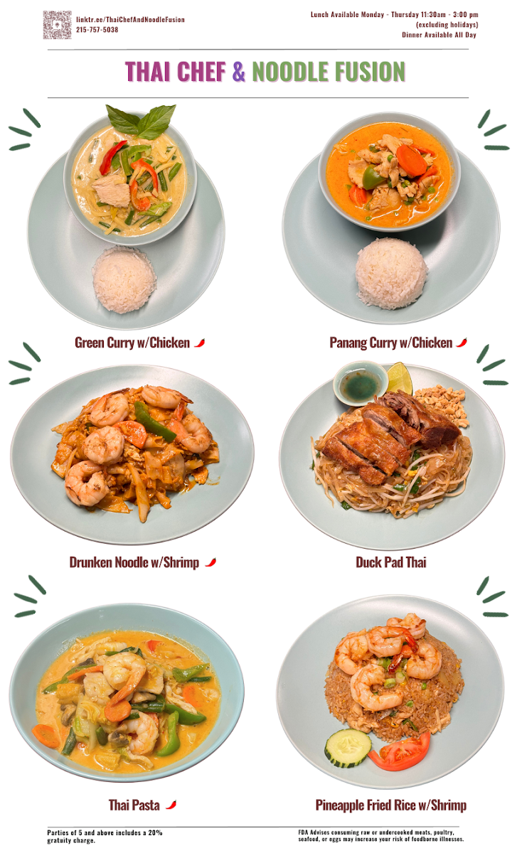 The menu at Thai Chef and Noodle Fusion offers a thoughtfully crafted selection of dishes that blend traditional Thai flavors with broader Asian influences. It’s a welcoming mix perfect for those seeking comforting noodle bowls, vibrant curries, or light bites in a relaxed setting.