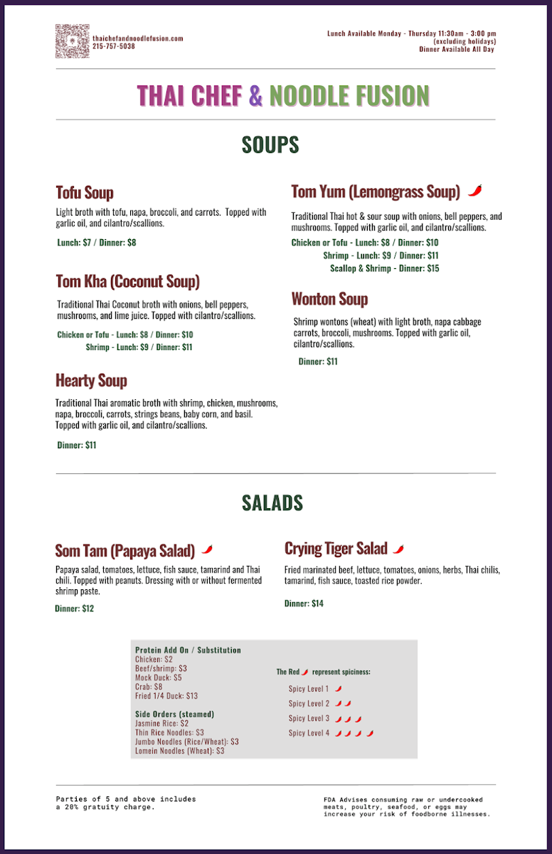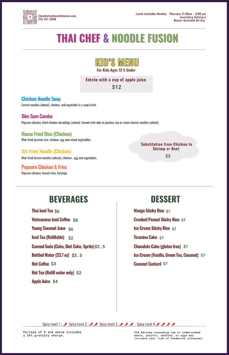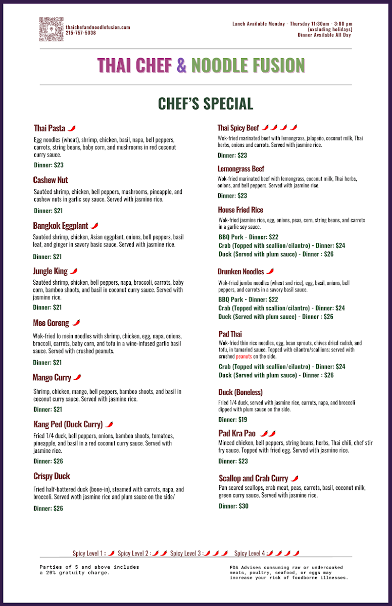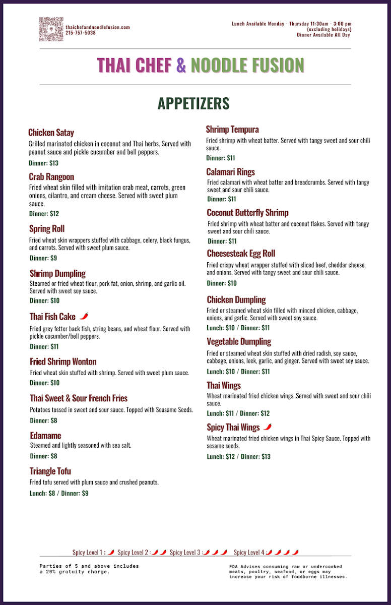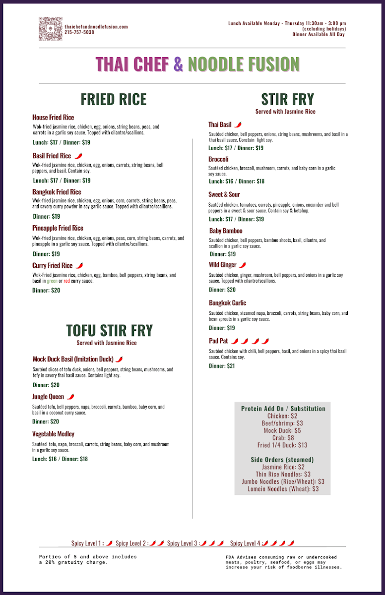 The menu at Thai Chef and Noodle Fusion offers a thoughtfully crafted selection of dishes that blend traditional Thai flavors with broader Asian influences. It’s a welcoming mix perfect for those seeking comforting noodle bowls, vibrant curries, or light bites in a relaxed setting.